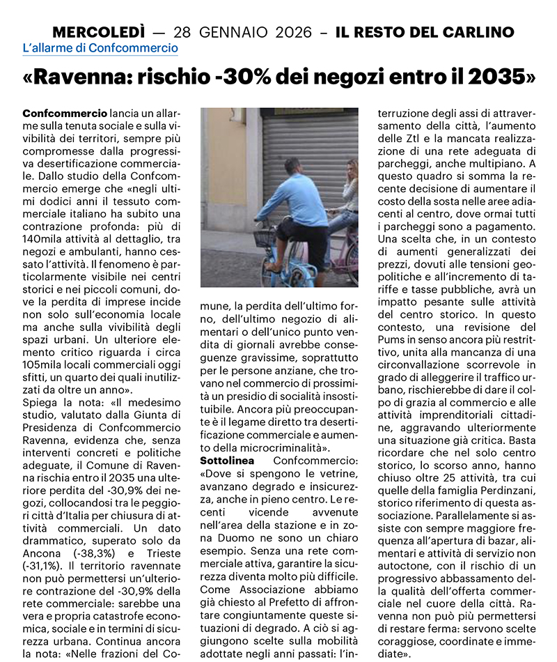 Confcommercio lancia un allarme sulla tenuta sociale e sulla vivibilità dei territori, sempre più compromesse dalla progressiva #desertificazionecommerciale. Dallo studio della Confcommercio emerge che «negli ultimi dodici anni il tessuto commerciale italiano ha subito una contrazione profonda: più di 140mila attività al dettaglio, tra negozi e ambulanti, hanno cessato l’attività. Il fenomeno è particolarmente visibile nei centri storici e nei piccoli comuni, dove la perdita di imprese incide non solo sull’economia locale ma anche sulla vivibilità degli spazi urbani. Un ulteriore elemento critico riguarda i circa 105mila locali commerciali oggi sfitti, un quarto dei quali inutilizzati da oltre un anno». Spiega la nota: «Il medesimo studio, valutato dalla Giunta di Presidenza di Confcommercio Ravenna, evidenzia che, senza interventi concreti e politiche adeguate, il Comune di Ravenna rischia entro il 2035 una ulteriore perdita del -30,9% dei negozi, collocandosi tra le peggiori città d’Italia per chiusura di attività commerciali. Un dato drammatico, superato solo da Ancona (-38,3%) e Trieste (-31,1%). Il territorio ravennate non può permettersi un’ulteriore contrazione del -30,9% della rete commerciale: sarebbe una vera e propria catastrofe economica, sociale e in termini di sicurezza urbana». Continua ancora la nota: «Nelle frazioni del Comune, la perdita dell’ultimo forno, dell’ultimo negozio di alimentari o dell’unico punto vendita di giornali avrebbe conseguenze gravissime, soprattutto per le persone anziane, che trovano nel commercio di prossimità un presidio di socialità insostituibile. Ancora più preoccupante è il legame diretto tra desertificazione commerciale e aumento della microcriminalità». Sottolinea Confcommercio: «Dove si spengono le vetrine, avanzano degrado e insicurezza, anche in pieno centro. Le recenti vicende avvenute nell’area della stazione e in zona Duomo ne sono un chiaro esempio. Senza una rete commerciale attiva, garantire la sicurezza diventa molto più difficile. Come Associazione abbiamo già chiesto al Prefetto di affrontare congiuntamente queste situazioni di degrado. A ciò si aggiungono scelte sulla mobilità adottate negli anni passati: l’interruzione degli assi di attraversamento della città, l’aumento delle Ztl e la mancata realizzazione di una rete adeguata di parcheggi, anche multipiano. A questo quadro si somma la recente decisione di aumentare il costo della sosta nelle aree adiacenti al centro, dove ormai tutti i parcheggi sono a pagamento. Una scelta che, in un contesto di aumenti generalizzati dei prezzi, dovuti alle tensioni geopolitiche e all’incremento di tariffe e tasse pubbliche, avrà un impatto pesante sulle attività del centro storico. In questo contesto, una revisione del Pums in senso ancora più restrittivo, unita alla mancanza di una circonvallazione scorrevole in grado di alleggerire il traffico urbano, rischierebbe di dare il colpo di grazia al commercio e alle attività imprenditoriali cittadine, aggravando ulteriormente una situazione già critica. Basta ricordare che nel solo centro storico, lo scorso anno, hanno chiuso oltre 25 attività, tra cui quelle della famiglia Perdinzani, storico riferimento di questa associazione. Parallelamente si assiste con sempre maggiore frequenza all’apertura di bazar, alimentari e attività di servizio non autoctone, con il rischio di un progressivo abbassamento della qualità dell’offerta commerciale nel cuore della città. Ravenna non può più permettersi di restare ferma: servono scelte coraggiose, coordinate e immediate».